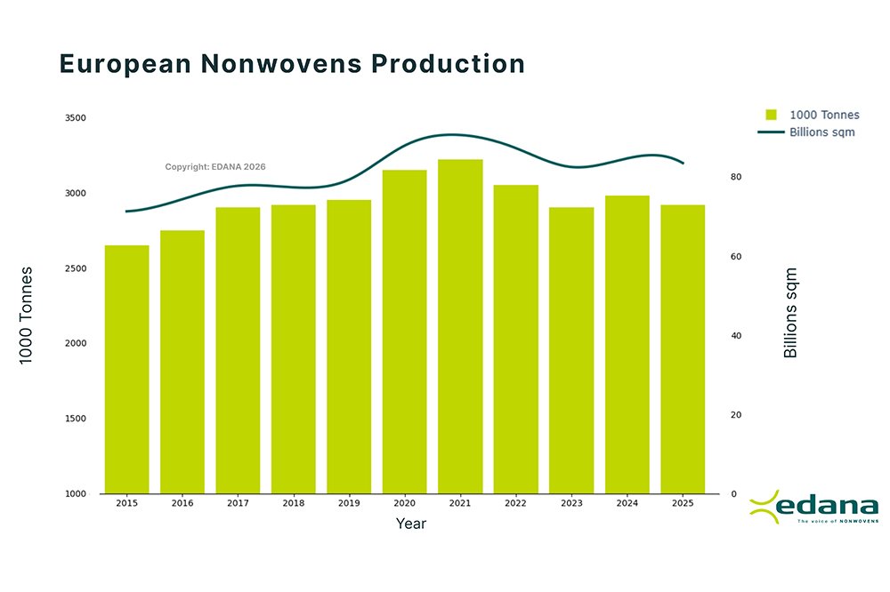 According to the figures collected and compiled by EDANA, overall nonwovens production in Europe declined by around 2.2% in 2025, reaching 2,919,000 tonnes.