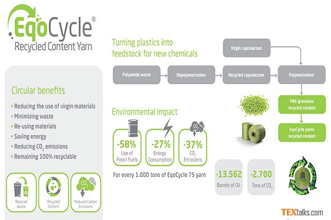 Customers have the assurance that for every 1.000 tons of EqoCycle yarn, 13,562 barrels of oil are saved and 2.700 tons of CO₂ emission are reduced, compared to PA6 traditionally made from virgin materials.Emmanuel Colchen, General Manager Yarns Division, comments: “EqoCycle is a perfect example of how higher resource efficiency in our industry can promote greater circularity in our customers’ industries. Minimizing waste, re-using materials, and saving energy and carbon emissions in production, it provides our customers and carpet brands with a new sustainable alternative that won’t compromise their end-product performance but will support their increasing focus on CO₂ reduction and global warming potential. All part of our wider commitment to encourage decoupling from the need for only virgin feedstocks and moving towards a circular economy for yarns and soft flooring industries.”