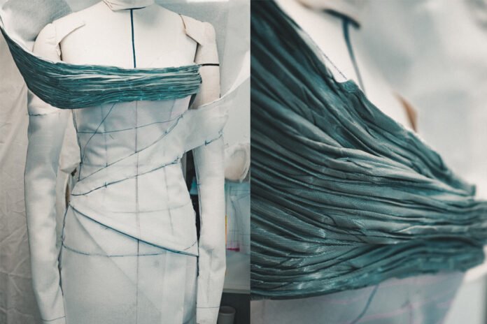 The gown, inspired by water’s purity and power, has been woven from a singular fine monofilament polyester yarn made up of 46% recycled Evian rPET flakes from Evian bottles. As for the dress, 46% of the fabric relies directly upon recycled plastics, meaning it easily meets the exacting standards of the GRS4.0, which requires that at least 20% of a product be created from recycled materials.