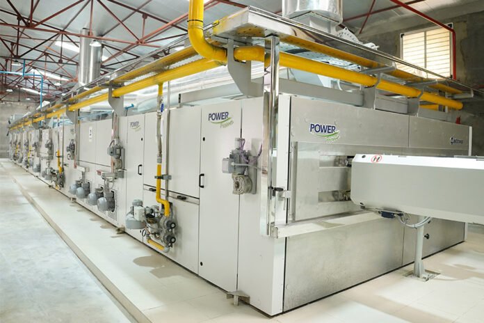 Another new product is the POWER-DRY PD-1, a completely newly developed relax and shrink dryer for finishing knitted fabrics. This dryer is suitable for both open and tubular fabrics and can be easily integrated into an existing line concept. Customers benefit from maximum evaporation capacity in the smallest possible length, optimum shrinkage values, excellent accessibility thanks to space-saving sliding doors, horizontal lint screens, low maintenance and cleaning times, and an energy-saving suction zone. The system can also be heated using a hybrid system or even CO₂-free using a high-temperature heat pump. The system has been specially designed for high-quality goods with a soft and voluminous hand, e.g., polo shirts, nightwear (interlock), single jersey T-shirts, or lining fabrics such as sweatshirts.