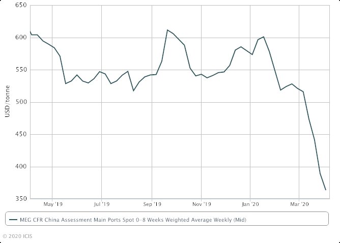 More than 90% of MEG in China goes into polyester production: As polyester demand is unlikely to post growth this year, MEG demand growth is projected to slow down to 0.6% from 5.0% in 2019, and will likely be accompanied by a 33% average decline in spot values, Qian said.