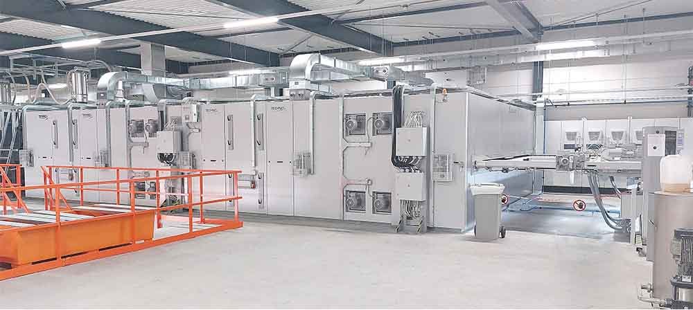 The oven is operated with green electricity and thus offers for the first time the possibility of a CO2 neutral production of tufting carpets. All electricity consumers such as fan drives, exhaust air fans or the drives of the fabric transport system are equipped with energy-efficient motors. The horizontal ball-bearing chain also ensures the lowest drive power due to low rolling friction.