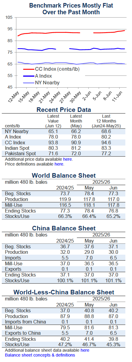 Cotton benchmarks were range-bound over the past month. With the nearby July NY/ICE futures contract heading into expiration, open interest has been shifting into the December contract. Prices for the December contract traded within a relatively tight range between 67 and 70 cents/lb over the past month. The A Index was steady between 77 and 79 cents/lb.
