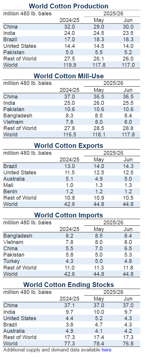 Relative to last month, the latest USDA forecasts for 2025/26 suggest slightly lower global production (-800,000 bales, from 117.8 to 117.0 million) and slightly lower global consumption (-300,000 bales, from 118.1 to 117.8 million). The figure for world beginning stocks was reduced -1.2 million bales (to 77.3 million), and the net result for global ending stocks was a -1.6 million bale reduction (to 76.8 million bales). The largest country-level changes for 2025/26 production projections were for India (-1.0 million bales to 23.5 million), the U.S. (-500,000 bales to 14.0 million), Pakistan (-300,000 bales to 5.2 million), and China (+1.0 million to 30.0 million). There was also a sizeable reduction to the Indian production figure for 2024/25 (-1.0 million bales to 24.0 million). For mill-use, the largest changes were for India (-500,000 bales to 25.5 million), Turkey (-200,000 bales to 7.3 million), Bangladesh (-100,000 bales to 8.4 million), and Egypt (+400,000 to 1.2 million).