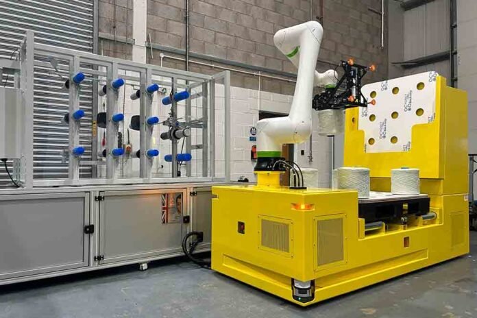 The Robot-AGV is designed to load and unload packages of fibre or yarn weighing up to 100kg on and off a range of equipment including tyre cord creels, winders, cabling and twisting machines, and shelving and racking structures, allowing manufacturers to reduce manual handling and improve processing speeds.