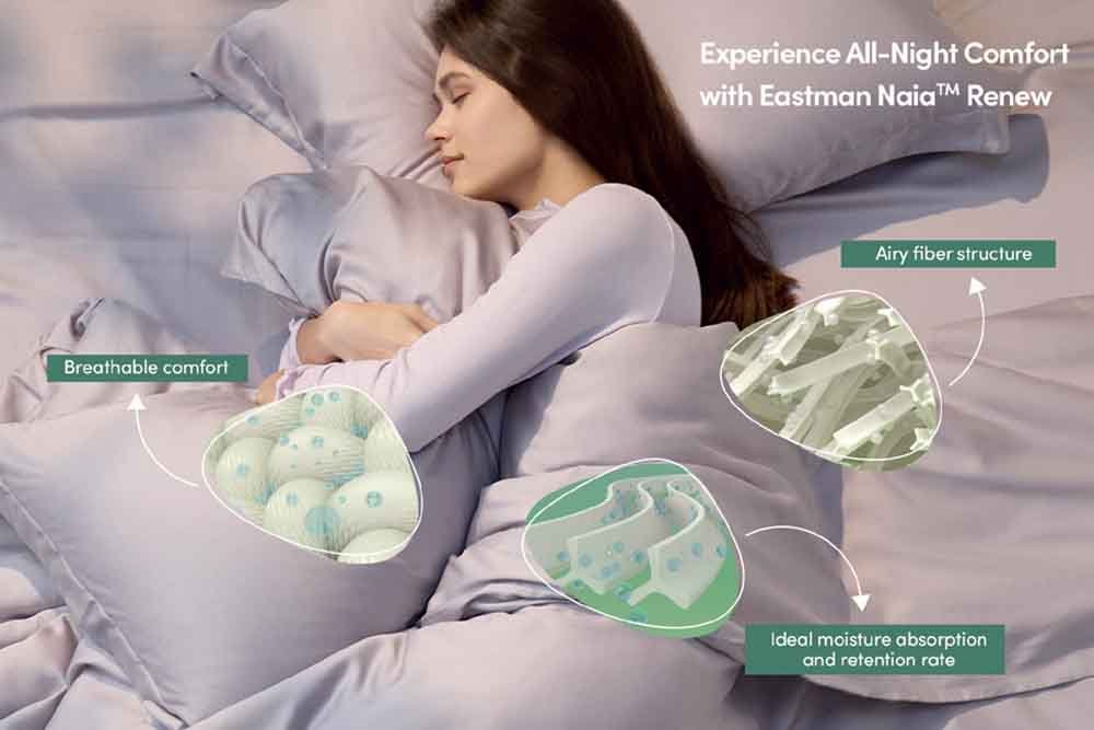 Expanding beyond its proven success in bedding and towels, Naia™ Renew now transforms comforters and quilts with breathable comfort, luxurious softness, and unparalleled ease of care. This represents a significant evolution in the application of Naia™ in home textiles, meeting the growing demand for high-performance, more responsible solutions. Manufactured through Eastman’s molecular recycling technology, Naia™ Renew fiber incorporates 60% sustainably sourced wood pulp and 40% recycled waste materials via GRS-certified mass balance. This innovative process reduces waste and carbon footprints while supporting a circular economy.