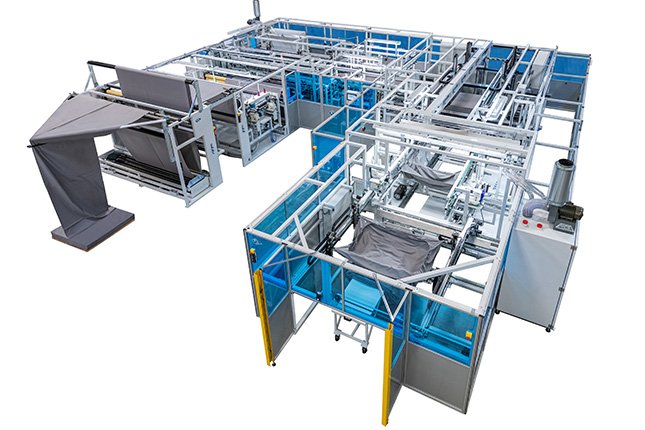 A side drop forming unit pre-forms the sheet before it is transported by a multi-axis clamp conveyor system to the corner sewing section, consisting of left and right overlock sewing heads. Here, the corners are robotically sewn at 90 degrees and labels are also attached when specified.