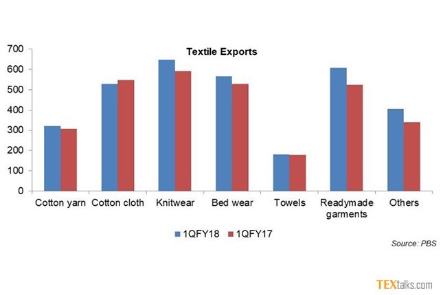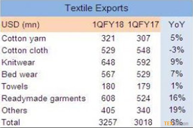 Compared to Sep-16, exports for the previous month picked up by 12% on a year-on-year basis. There was double-digit growth in cotton yarn, garments and knitwear. The growth in various segments could be attributable to implementation of some of the assurances made in the PM textile package.