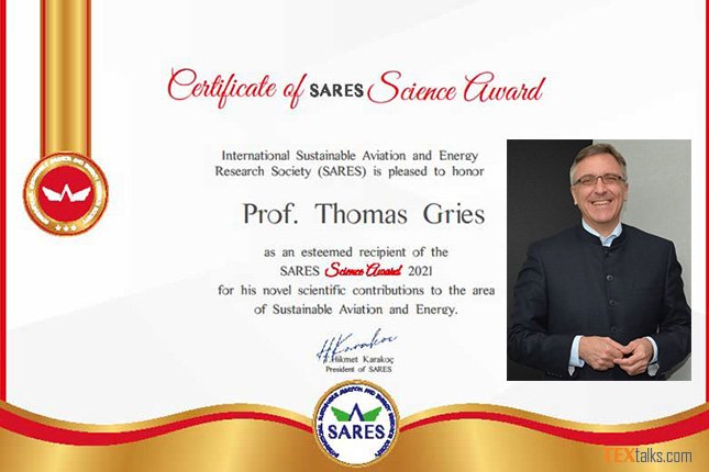 Scientific Award for International Sustainable Aviation and Energy Society (SARES Award) was awarded to Professor Dr Thomas Gries from the Institut für Textiltechnik (ITA) of RWTH Aachen University. The award ceremony took place during the closing ceremony of the International Symposium on Sustainable Aviation (ISSA) in a hybrid format online and simultaneously at Kasetsart University, Bangkok, Thailand.