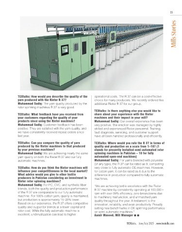 consumption, and exceptional yarn consistency, even Muhammad Sadiq: Our end product ranks among the machine efficiency, which is comparable to that of a TEXtalks: How do you think the Rieter machines will very close to fully automatic OE machines. However,