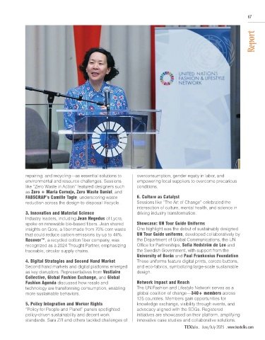 On 19 May 2025, the United Nations Fashion and • "Policy for People and Planet" panel, featuring repairing, and recycling—as essential solutions to overconsumption, gender equity in labor, and across UN agencies, governments, developers,