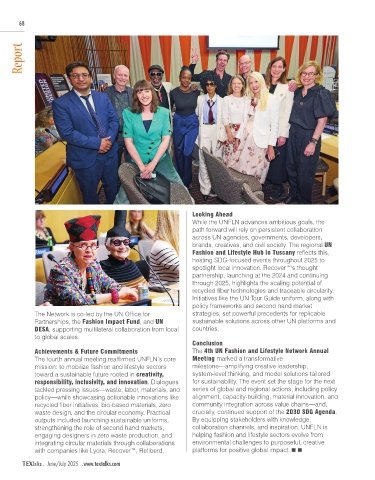 On 19 May 2025, the United Nations Fashion and • "Policy for People and Planet" panel, featuring repairing, and recycling—as essential solutions to overconsumption, gender equity in labor, and across UN agencies, governments, developers,
