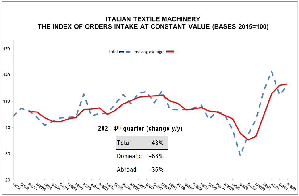 The index of orders intake for Italian textile machinery for the fourth quarter of 2021, processed by ACIMIT