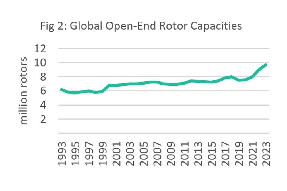 The estimated global number of installed short-staple spindles reached 232 Mio units in 2023 and the number of installed open-end rotors grew to 9.7 Mio (see Fig. 1 and 2). Capacity building is still disproportionally targeting Asia.