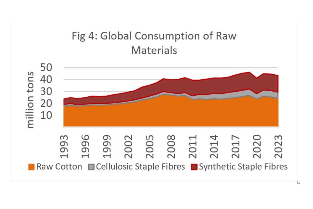 7 Mio in 2023 (see Fig. 3). Total raw material consumption in the short-staple organized sector slightly decreased to 43 Mio tons (see Fig. 4). Global consumption of raw cotton and cellulosic short-staple fibers decreased by -4.4% and -2.9%, respectively. Consumption of synthetic short-staple fibers increased by 0.5%.