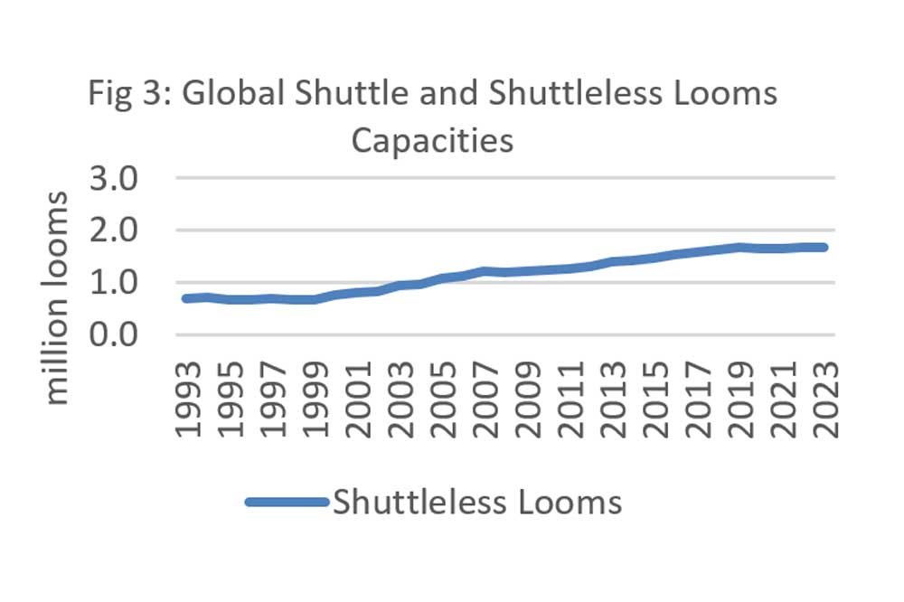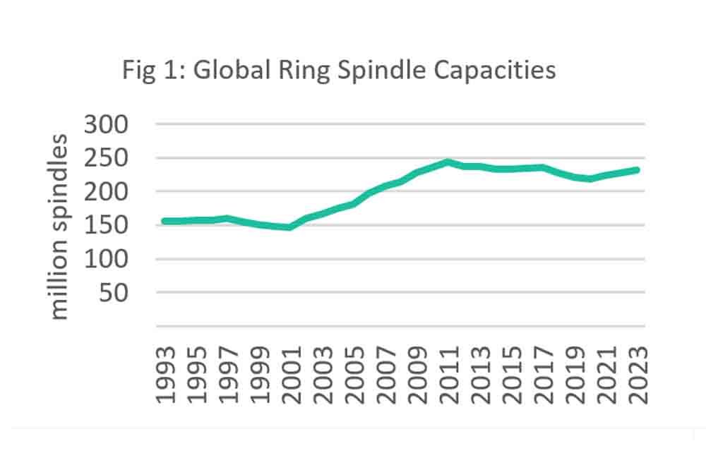 The estimated global number of installed short-staple spindles reached 232 Mio units in 2023 and the number of installed open-end rotors grew to 9.7 Mio (see Fig. 1 and 2). Capacity building is still disproportionally targeting Asia.