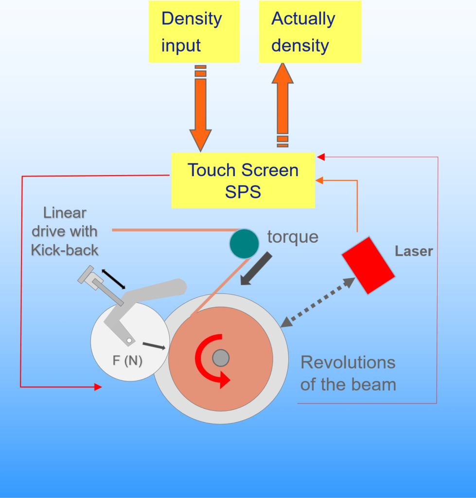 During manufacturing of the dyeing beams, the driven torque increases the difference in speed between the yarn draw-off and the yarn wind-up in order to reduce the yarn tension. At the same time, the laser sensor ensures that the measurement is reliable and slip-free so that the density is always under control.