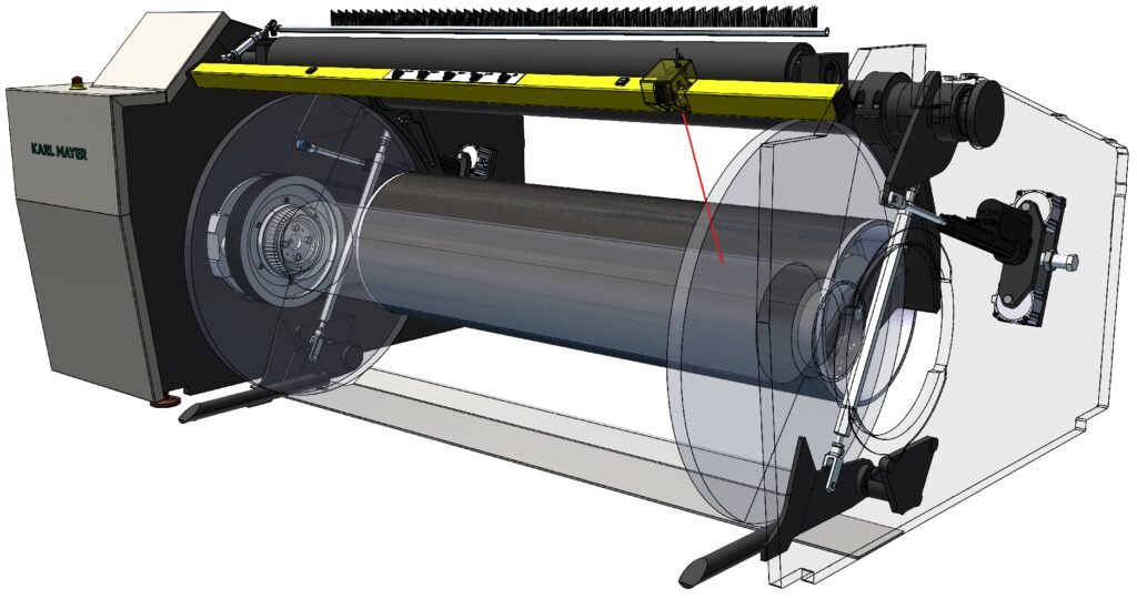 The speed of the torque is also regulated electrically, and the warp beam is equipped with KARL MAYER’s tried-and-tested, zero-maintenance, hydro-pneumatic brake system. This hybrid component uses a hydraulic main brake cylinder that is controlled by a pneumatic cylinder. Even when faced with increases in batch diameter and differences in the number of threads, the ingenious system guarantees constant forces at all times, and thus incredibly short braking distances.