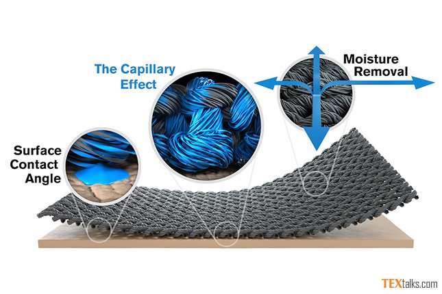 The yarns leverage the science of contact angles and capillary action to transport moisture away from the skin naturally. TurboDry is more than just a wicking fabric, and it is a new dimension in drying technology. TurboDry relies on biomimicry to provide ideal one-way moisture transport, and it performs better than leading wicking fabrics without the use of chemical coatings. Because TurboDry fabrics rely on physics, their drying abilities last and last and last; TurboDry is fully recyclable and can be made from recycled material.