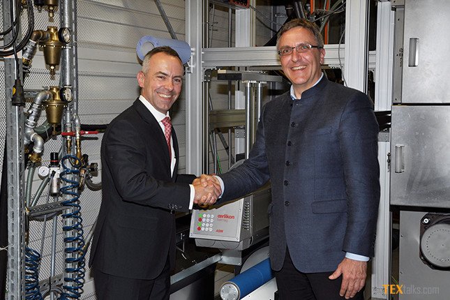 In May 2017, Jochen Adler, Vice-President and Chief Technology Officer at Oerlikon Textile GmbH & Co. KG, presented an Oerlikon Barmag take-up winder as a partial gift to Prof. Dr. Thomas Gries, head of the Institut für Textiltechnik (ITA) at RWTH Aachen University. The new Type ASW602 winder, which is equipped with modern control software and user interface, replaces the former institute’s Barmag take-up winder.