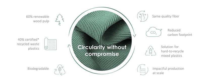 The 20% recycled cellulose comes from waste materials, textiles waste, and non-forest-derived cellulose waste.