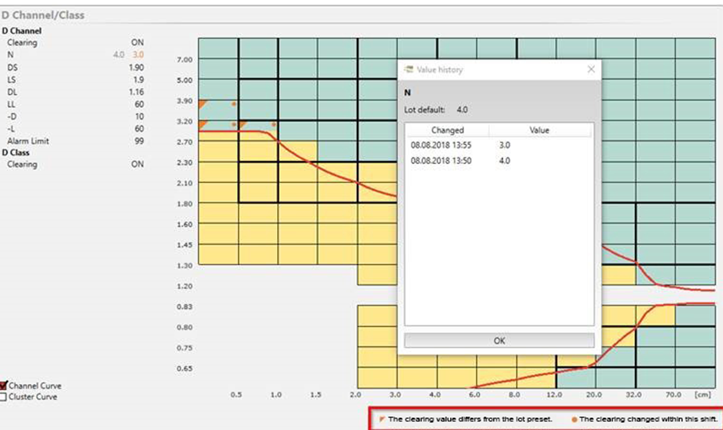 A click on the icon automatically opens the relevant shift book, which contains all changes to the settings together with a time stamp. The user can easily review, when the change has been made and how much yarn has been wound since the change. The shift book contains all changes, which have been done during the last four days. In addition, all yarn clearer settings are stored in the shift reports for later review. The graphical presentation of the yarn clearing results contains also an indication of changed clearing values and of differences between the actual settings and the presets for the production lot.