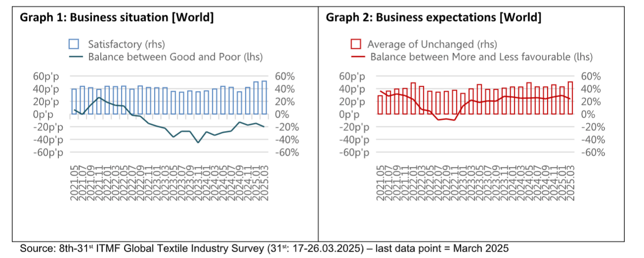 In March 2025 global textile industry struggled but kept resilient optimism April 7th, 2025 – The International Textile Manufacturers Federation (ITMF), has released the results of its Global Textile Industry Survey (GTIS) for March 2025. This survey, conducted regularly across all key regions and segments of the textile value chain, revealed a complex picture of a deteriorated business situation, cautious optimism, regional divergence, and ongoing structural challenges.