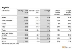 Rieter’s sales increased to CHF 515.3 million in the first half of 2018, an increase of 24% compared to the previous year period (first half year 2017: CHF 415.2 million). This increase resulted from the organic growth of the Business Groups Machines & Systems and After Sales and the acquisitive growth of the Business Group Components.