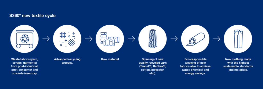 S360o is an innovative, sustainable circular cycle that gives fabrics a brand-new life. Spain-based mill Textil Santanderina is closing the loop with its S360 production process. The solution takes pre-and post-consumer waste and upcycles it into new textiles. At a recycling plant in Morocco, the fabric first goes through stripping machines that separate the scraps into smaller pieces, and then the fibers are carded to clean and combine before spinning. The mill saves on water, chemicals, and energy by repurposing scraps and deadstock.