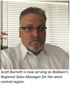 “I am eager to build relationships with customers by articulating appropriate technology to enhance their throughput, efficiency and quality,” Burnett said. “By understanding clients’ needs and improvement goals, and partnering with them via Baldwin’s offerings, I will help them grow their businesses.”