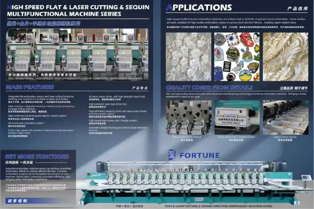 Adhering to the business philosophy of “Focus, Pragmatism, Progress and Innovation”, the company has accumulated a large number of loyal users in the market with excellent product quality and a serious and responsible business attitude. The company’s main products include: high-speed embroidery machines, multi-functional sequin machines, bead embroidery machines, towel machines, corded machines, laser machines and other popular models. With multi-function, stability and high efficiency, these machines meet the production needs of different customers and have been widely praised in domestic and foreign markets.