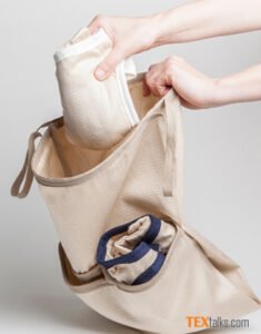 The basis for the innovative design form Kelheim’s functionalised specialty viscose fibres with adapted cross-sections. Needle-punched / thermobonded nonwovens with a blend of specialty viscose and PLA bicomponent fibres were chosen to ensure the product’s washability. PLA stands for polylactic acid made from natural and renewable raw materials. By combining nonwovens, usually found mainly in the single-use sector, with reusable products, Sumo and Kelheim Fibres have chosen a completely new approach.