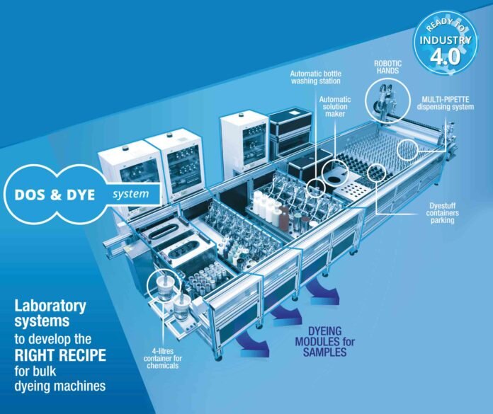 developing the right recipe for bulk dyeing machines, in order to avoid correction and re-dyeing in production with considerable time and resource savings. Composed of a Dosorama dispensing machine and one or more robotized dyeing modules, the DOS&DYE® works independently for 24 hours a day and 7 days a week.