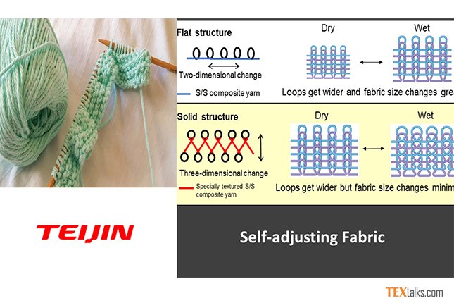 Teijin Frontier has announced a new self-adjusting fabric with a solid knitted fabric structure that changes shape in three directions in response to perspiration thanks to its specially textured, side-by-side (S/S) composite yarn made from two types of polymers, each with different hygroscopicity. The yarn’s structure also includes a coiled crimp.