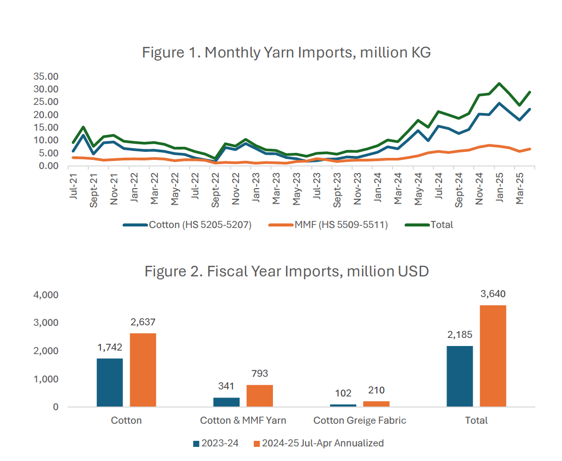 As a result, exporters have switched to imported inputs. Monthly yarn imports are over twice the historic peak (figure 1), expected to hit 300 million kg in FY25—nearly triple the 108 million kg in FY24. In total, imports of just three key raw materials—cotton, yarn, and greige fabric—are expected to be $1.5 billion higher than last year (figure 2). Meanwhile, exports are only projected to increase by $1.14 billion. More dollars are flowing out of Pakistan than coming in.