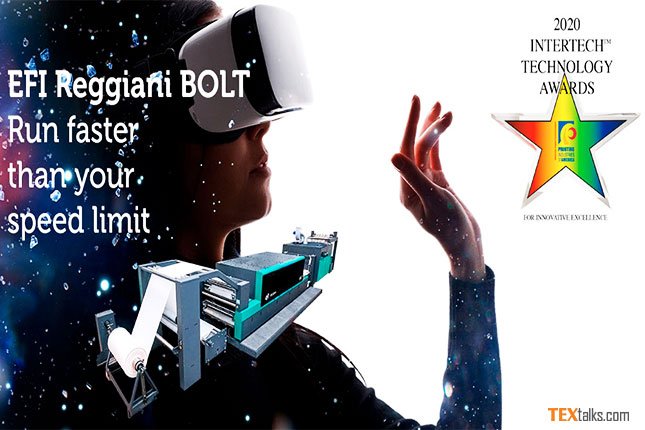 EFI Reggiani cutting-edge BOLT single-pass, currently the fastest digital Textile printer in the market, was a rare unanimous choice in the contentious InterTech judging process and is the first Textile printer that ever won an InterTech Award.