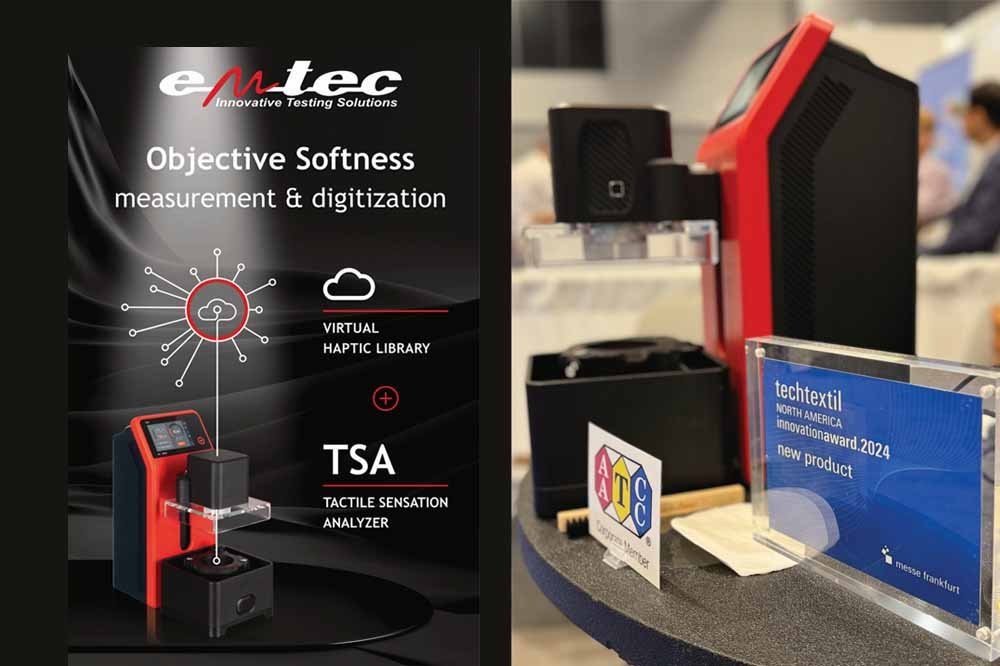 The German company emtec Electronic plans to continue its success story of objectively measuring haptic parameters of fabrics and apparels by showcasing the TSA Tactile Sensation Analyzer at its booth and giving a presentation on how to optimize communication in the textile industry supply chain with the help of objective softness measurement and the digital use of test results.