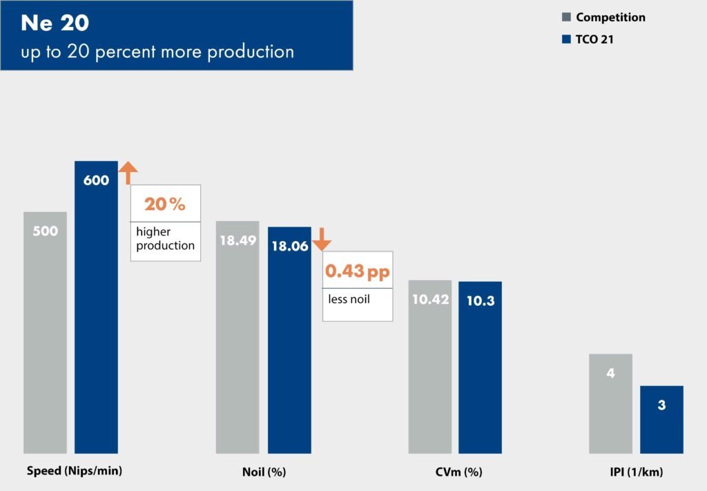 Overall, the TCO 21 has demonstrated its capacity to deliver optimal yarn results even when increasing the production rate by up to 20 %.