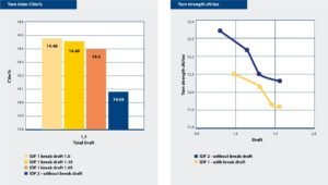 The second diagram illustrates that IDF 2 and IDF 1 both have the same trend, i.e. that the yarn strength decreases with increasing total draft. Compared to IDF 1, IDF 2 shows overall strength at a higher level. This confirms the statement that the use of only one drafting zone has a positive effect on the yarn properties.