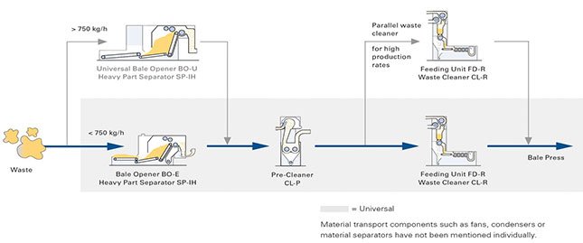 It is also possible to reclaim the share of good fibers from production waste, such as blow room and carding waste, and reintroduce it into the spinning preparation process. A separate Truetzschler waste recycling line with particularly intensive cleaning by the Waste Cleaner CL-R increases the degree of opening and enables recycling down to the last good fibers.