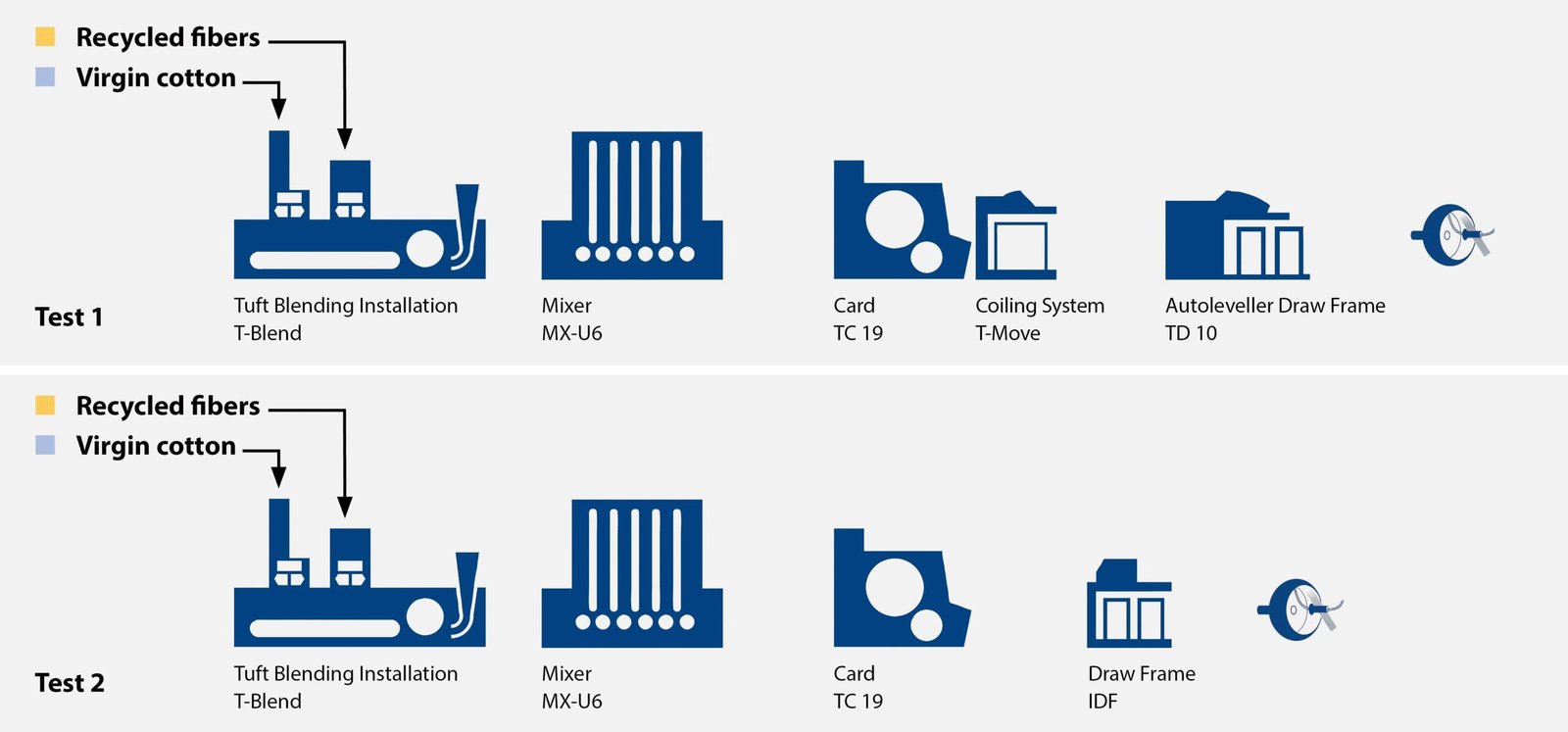 The team from Valérius 360 wanted to find ways of improving the processes for yarns made from 50 % recycled and 50 % virgin cotton (Ne30). In particular, it was seeking ways to reduce thick and thin spots, which disturb the appearance of the textile surface. At the Trützschler Technical Center in Mönchengladbach, special trials were conducted that showed that using a direct spinning process for this application delivers much better results than a process with a draw frame passage for rotor yarns.