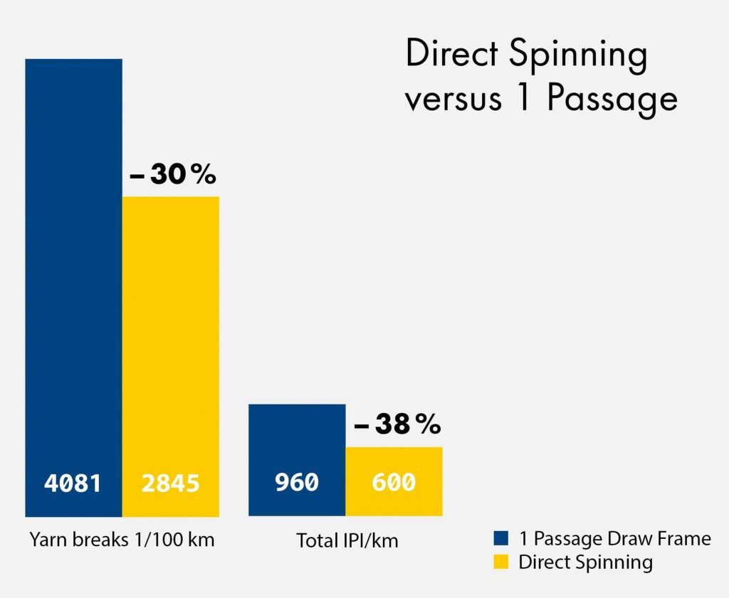 Direct spinning showed a clear capacity to reduce the number of faults in the yarn. As a result, the yarn breaks were 30 % lower and the Total IPI 38 % lower (see figure 2). The direct spinning process also has a positive effect on energy consumption: Compared to the process with a draw frame passage, for medium plant size, a savings potential of 5 % is achieved with direct spinning. At an energy price of 0.2 €/kW, the savings amount to over 5,000 € per year.