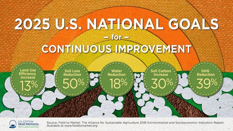 Over the past 35 years, U.S. cotton has made significant improvements in growing cotton responsibly. To continue the progress, the Trust Protocol has ambitious national goals for 2025. By this date, the Trust Protocol aims to have more than half of all U.S. cotton production included in the program.