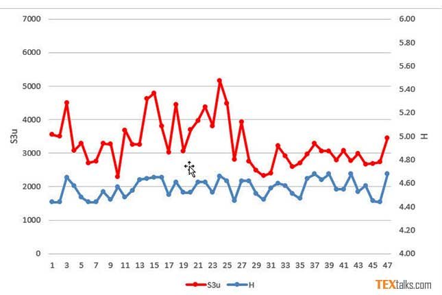 The purpose of a second trial was to evaluate the behavior of the ring traveler throughout its life cycle, using Uster Tester 6. This trial was conducted at an Indian mill producing a 100% viscose Ne 30 ring yarn with an expected traveler lifetime of eight days. In the trial, 10 cops from the same ring spinning frame and spindle were measured with Uster Tester 6 after every doff, spanning 47 different doffs in total.
